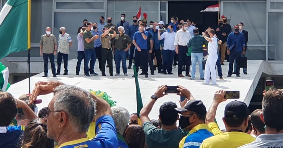 De máscara e ao lado dos ministros e de parlamentares, Bolsonaro acompanhou a manifestação do alto da rampa do Planalto.