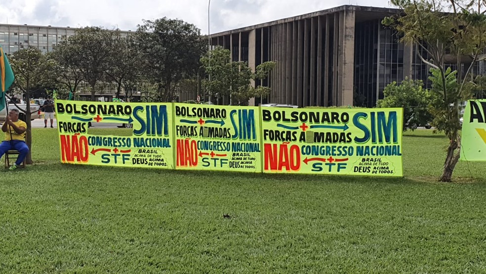 Embora o presidente possa não ter avistado, havia faixas com dizeres “Fora Congresso” e “Fora STF”. Também havia faixas de protesto contra os presidentes da Câmara, Rodrigo Maia (DEM-RJ), do Senado, Davi Alcolumbre (DEM-AP) e contra ministros do Supremo Tribunal Federal.