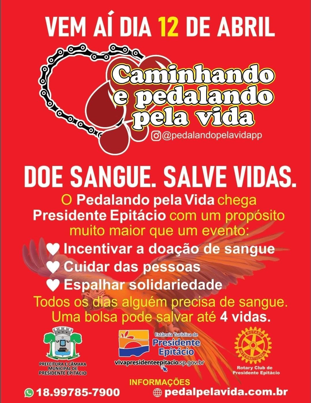 A Prefeitura da Estância Turística de Presidente Epitácio, por meio da Secretaria Municipal de Saúde, com apoio do Rotary Club de Presidente Epitácio, promove neste domingo (12) o 1º Caminhando e Pedalando pela Vida, evento que une atividade física, conscientização e solidariedade em homenagem aos doadores de sangue do município.