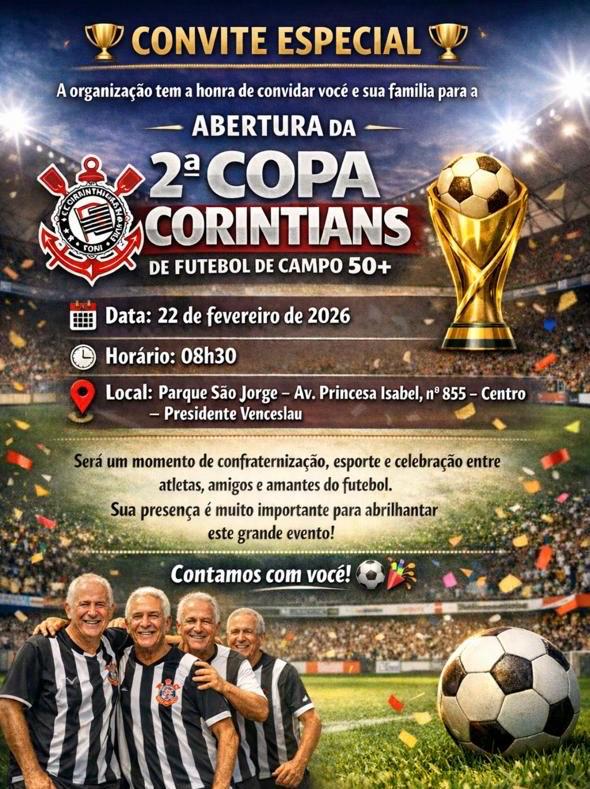 A diretoria do Esporte Clube Corintians de Presidente Venceslau está nos preparativos finais para a abertura da 2ª Copa Corintians de Futebol de Campo 50+, que acontece no próximo domingo, dia 22. A competição contará com a participação de diversas agremiações de Presidente Venceslau e de cidades da região.