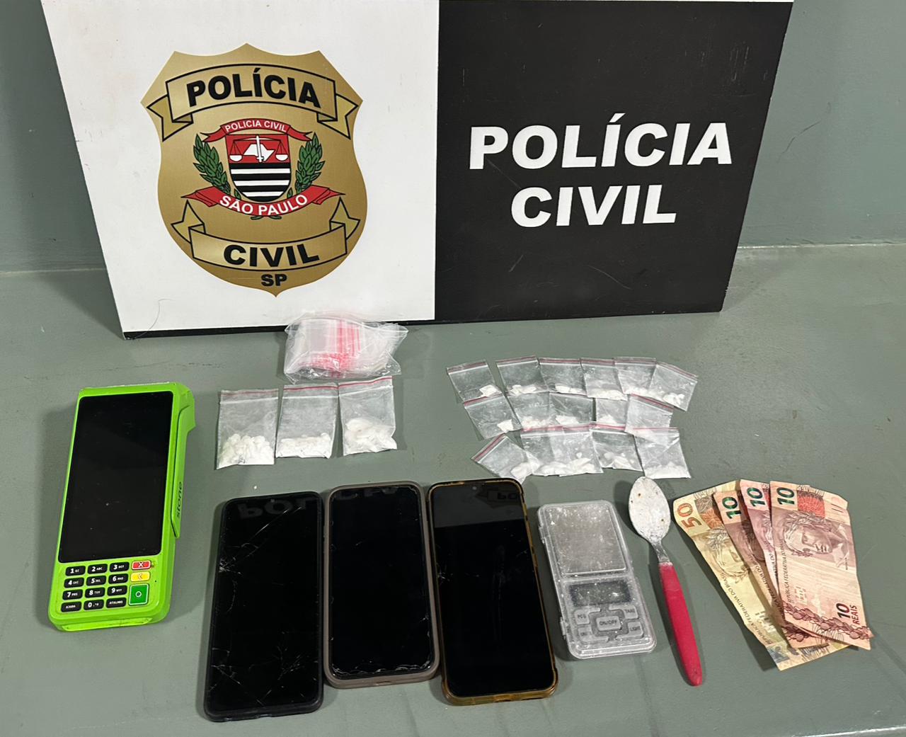 Durante a ação foram apreendidos ainda uma colher usada para mistura da droga com bicarbonato, três aparelhos celulares, uma máquina de cartão empregada para recebimento dos valores provenientes da venda ilícita e um veículo utilizado pelos suspeitos momentos antes da ação.