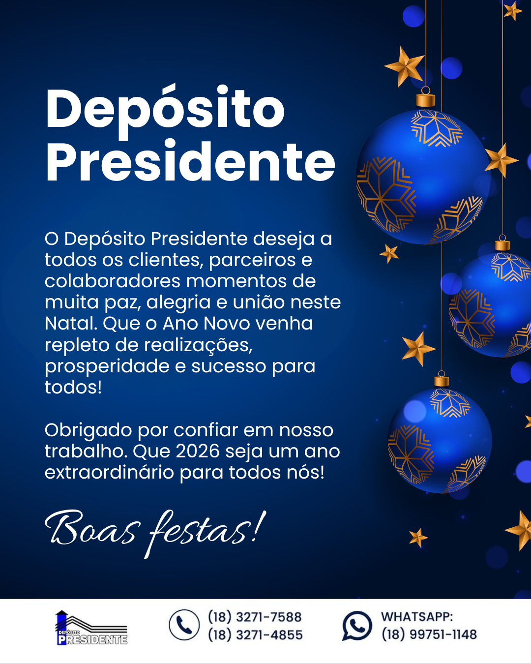 O Réveillon 2026 na Orla de Presidente Epitácio é uma realização da Prefeitura Municipal da Estância Turística de Presidente Epitácio e Câmara Muncipal, com aporte do Ministério do Turismo e Governo Federal. AMN