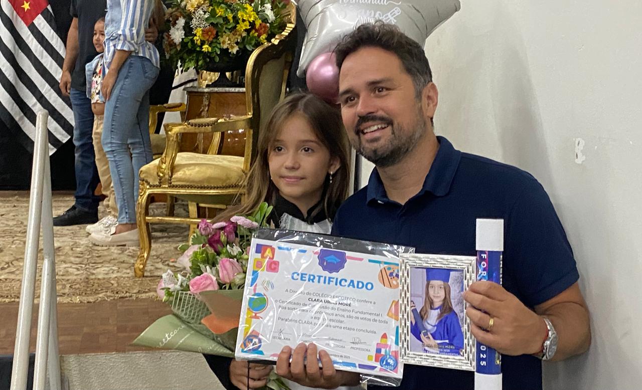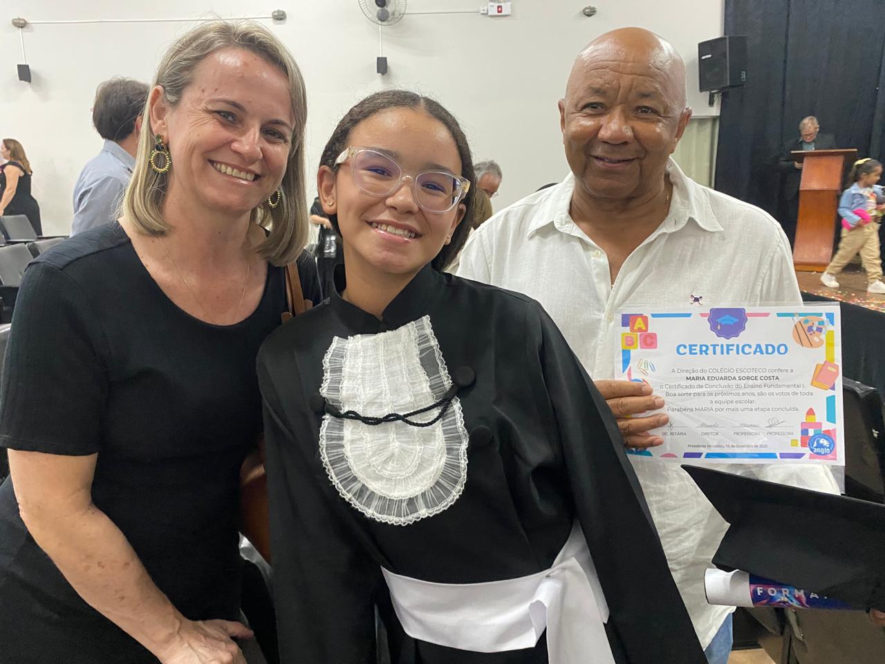 Vejam a foto da Maria Eduarda, filha do Testa e da Cláudia Sorge, da Autoeste. Ela se formou junto com a minha netinha Clara no 5º ano do Ensino Fundamental da Escoteco.