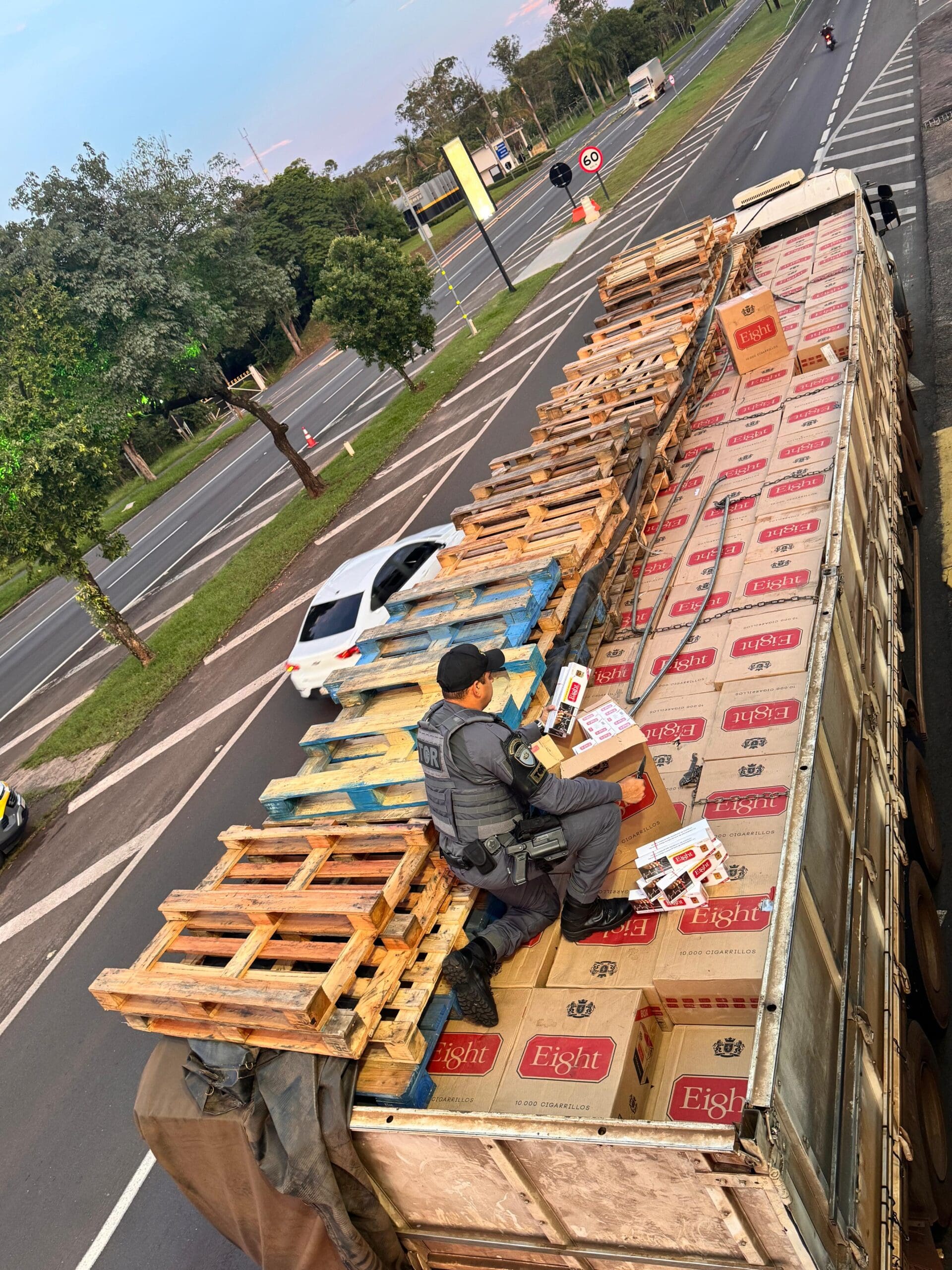 Os policiais abordaram um caminhão Scania/T124, acoplado a um semirreboque SR/Randon, ambos com placas de Dourados (MS). Durante a vistoria no compartimento de carga, foi constatado o transporte de uma grande quantidade de cigarros da marca Eight, de origem estrangeira.
