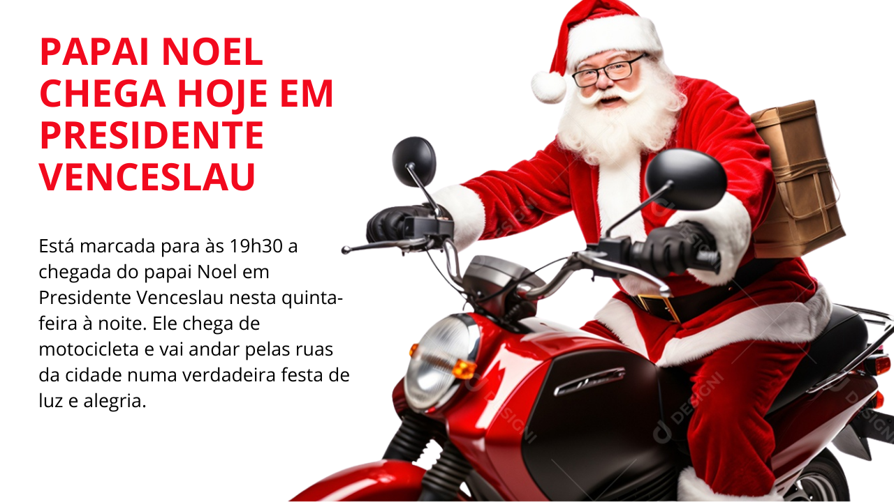 Um Papai Noel chegando de motocicleta: essa foi a principal marca da chegada do bom velhinho em Presidente Venceslau, nesta quinta-feira, dia 11. Ele desfilou pelas principais ruas da cidade acompanhado pelo grupo Boinas Pretas, em meio a um cortejo com personagens que representavam o nascimento de Jesus. A escola de dança Balonê também participou, trazendo ainda mais brilho ao evento.