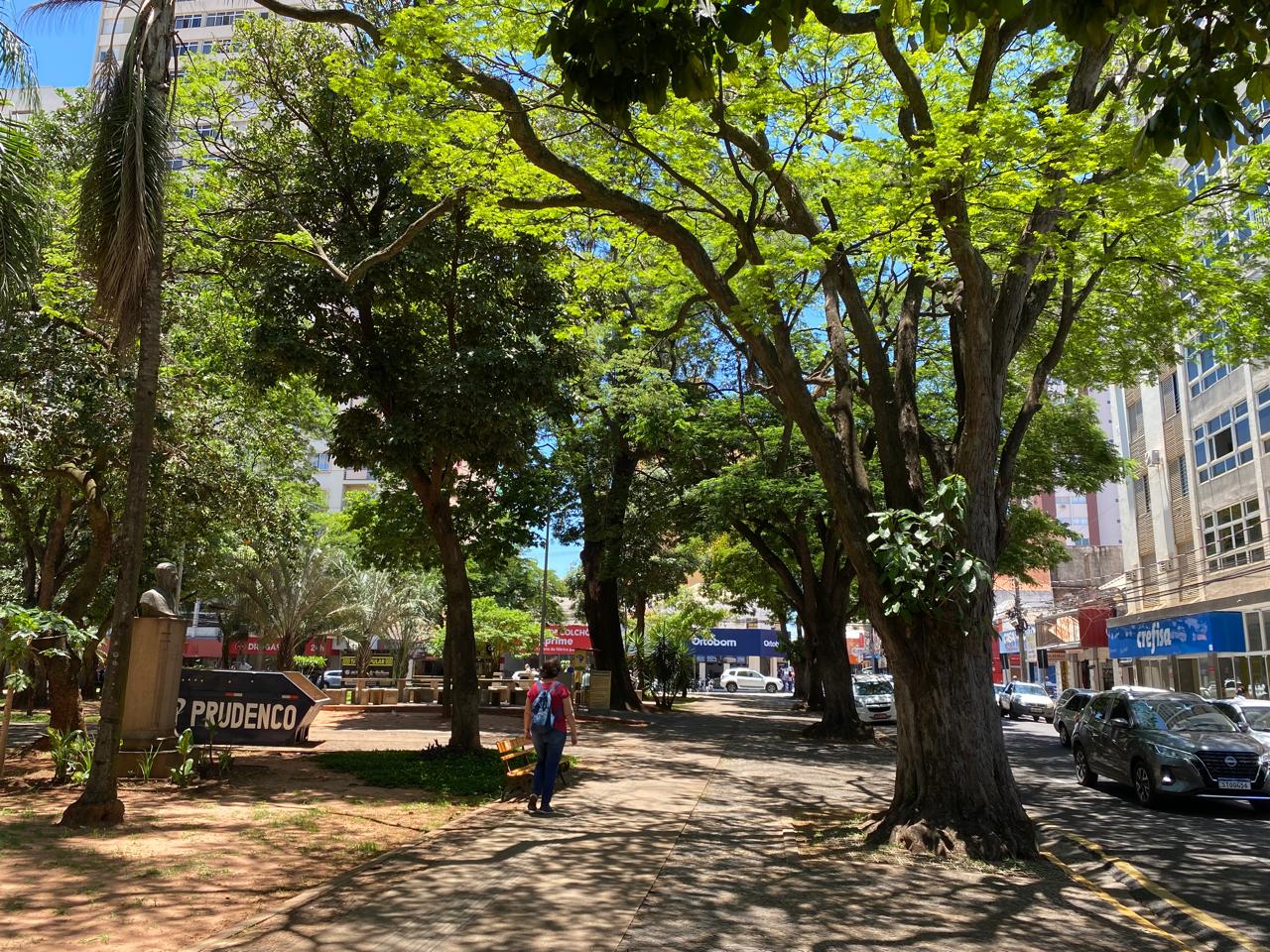 Nesta foto é possível observar o cuidado dedicado às árvores das praças de Presidente Prudente. As espécies são antigas, especialmente na Praça da Matriz, e a poda realizada ali merece destaque. O trabalho é feito retirando apenas o excesso das copas na parte inferior, preservando o crescimento natural da árvore.